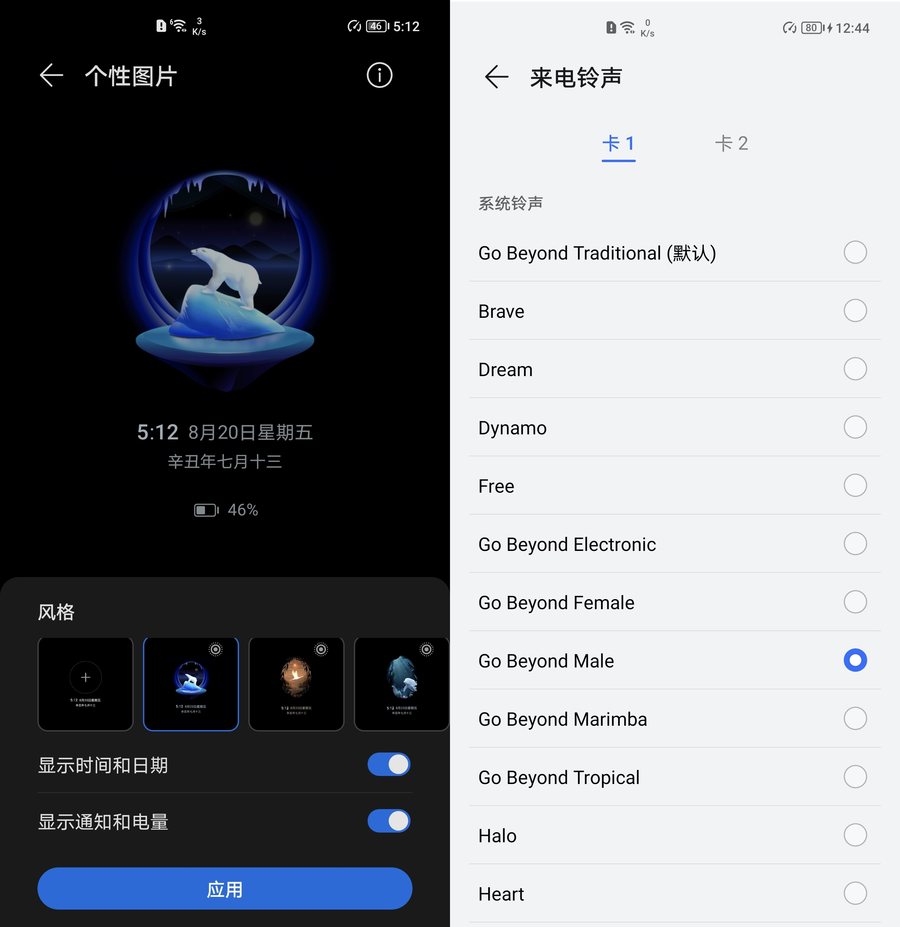 全新的预置动态主题“苍穹”和“洞见”,实现了从息屏-亮屏-解锁,一整套连贯的视觉效果。