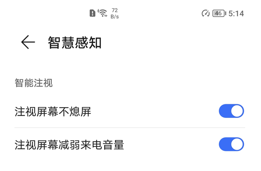 Magic UI 5.0新增智慧感知功能,录入面部数据后,即可启动“注视屏幕不熄屏”功能,用户浏览手机时注视屏幕,屏幕将保持长亮。当有电话拨入时,注视屏幕即可减弱来电音量。