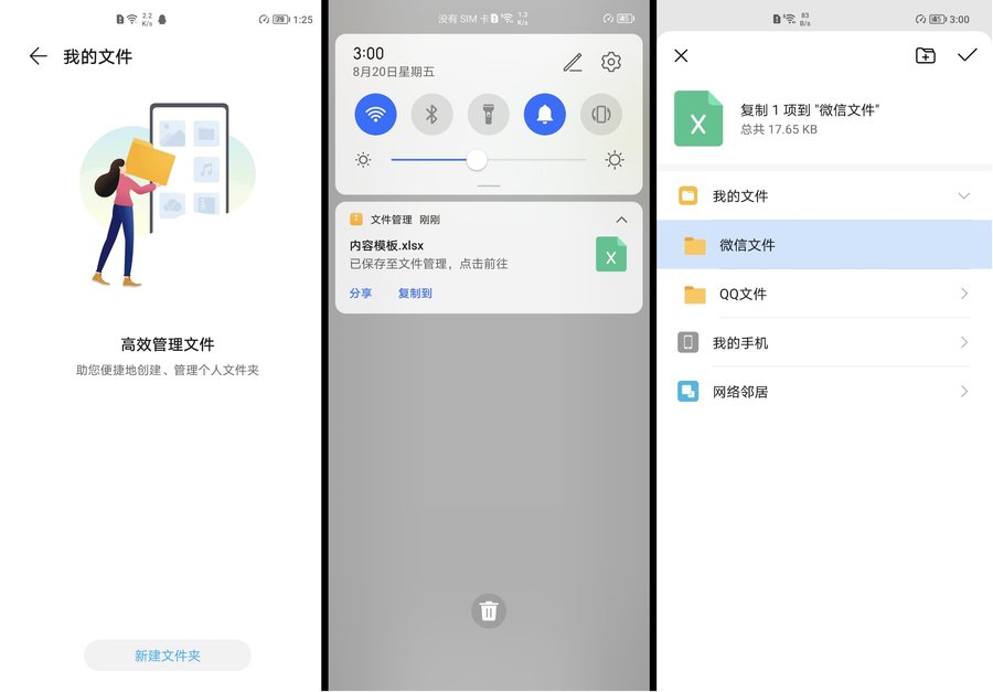 比如,用户通过微信打开文件即可触发自动下载,下载完成后,手机就会提示你将它复制保存到“我的文件”中,这样我们就能像管理电脑的文件那样分门别类、清晰直观。