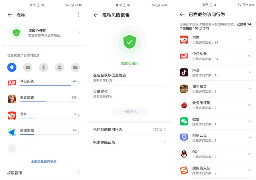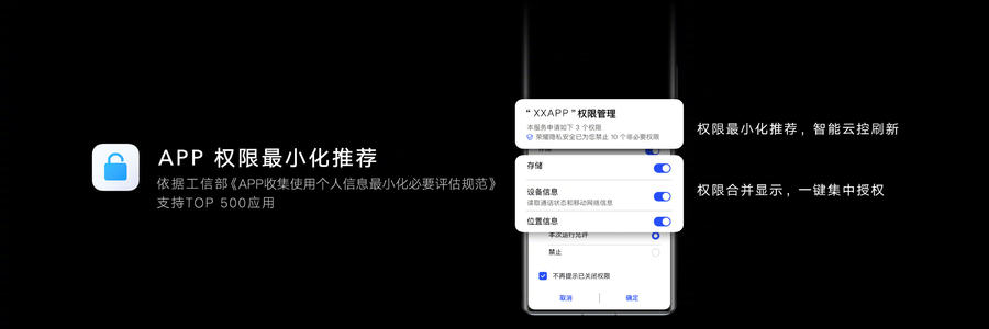 APP权限最小化推荐功能支持应用商店TOP 500的应用,对于在这500款外的应用,也可以通过设置-隐私中点击“一键优化”过滤掉非必要权限。