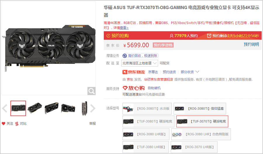 近期显卡的价格又大面积地涨上去了。京东自营上面已体现了出来,显卡普遍没货。即使有货的,也大都开启了预售模式,例如华硕的这款TUF系列RTX3070Ti,大家可以试一试手气。