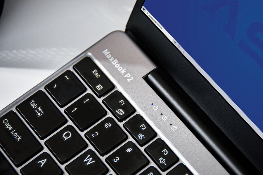 键盘面左前方设计了“MaxBook P2”字样,以及三枚指示灯。
