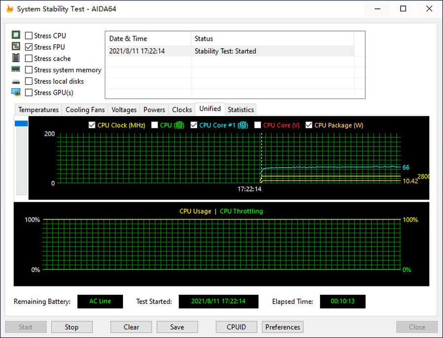 开启FPU烤机10分钟之后,这款轻薄本的CPU温度稳定在了66摄氏度左右,频率稳定在了2.8GHz,此时功耗为10W。可以说它的这套散热设系统是很可靠的,能够充分发挥出赛扬N5095这款处理器的性能。