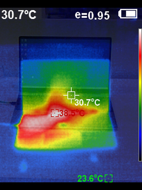 开启FPU烤机10分钟之后,笔者还对这款轻薄笔记本的键盘面进行了红外线热成像测试。此时,键盘面的左侧温度偏高,右侧温度比较低。整个键盘面的表面温度都没有超过40℃,表现也不错。
