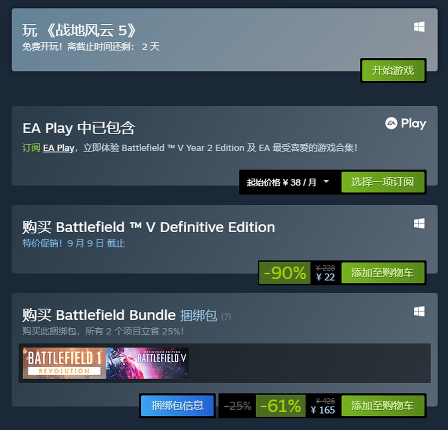 截止目前查看的消息显示,《战地 5》Steam 免费试玩活动距离结束还剩两天,而《战地 5:终极版》的 Steam 平台 1 折促销活动截止到 9 月 9 日。