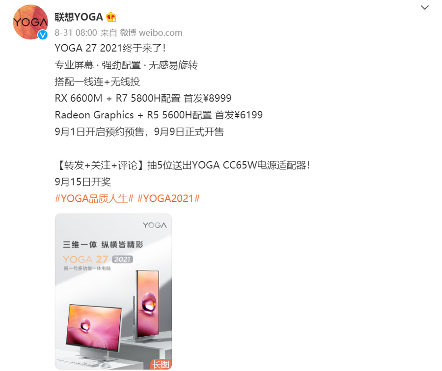 近日,联想官方公布了YOGA 27 2021一体机新品,Radeon Graphics + R5 5600H配置首发价6199元,RX 6600M + R7 5800H配置首发价8999元。这款新品在9月1日开启预约预售,9月9日正式开售。