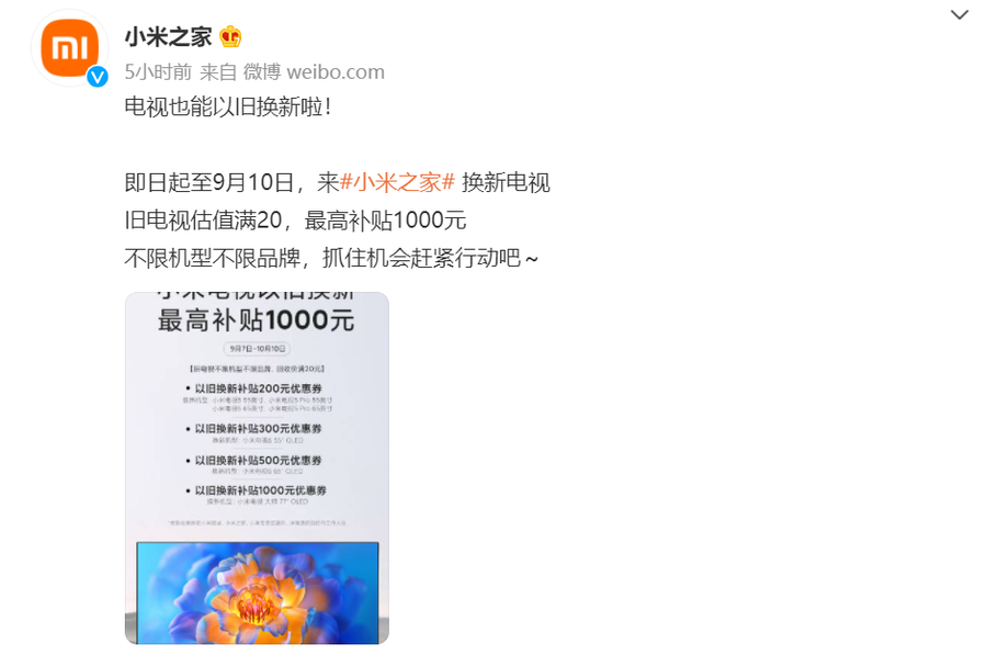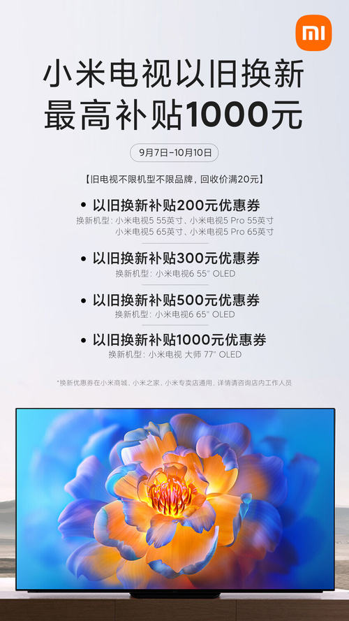 9月7日,小米之家官微宣布,小米电视开启以旧换新活动,即日起到9月10日,到小米之家以旧换新电视,最高补贴1000元。