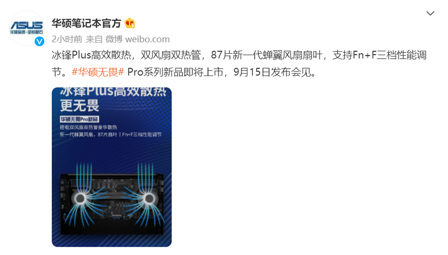 9月13日,华硕笔记本官方微博预热华硕无畏 Pro系列新品,透露了更多配置信息。