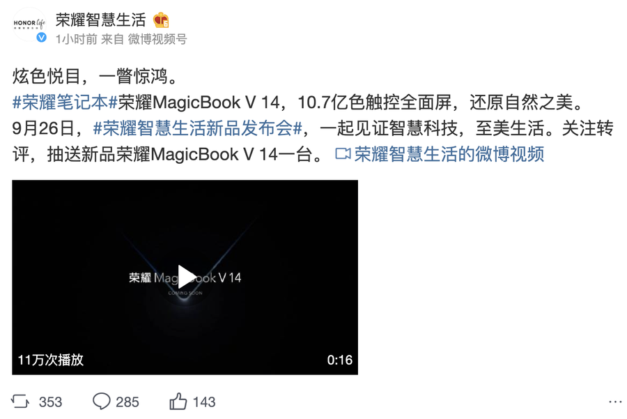据荣耀智慧生活官微信息,9月26日荣耀将会举办智慧生活新品发布会,根据预热海报来看,在发布会上荣耀将会推出了全新的笔记本电脑、平板以及智慧屏产品。特别是荣耀MagicBook V 14的发布,预示着荣耀在手机产品进军高端市场之后,也在智慧生活品牌上向高端市场发起冲击。
