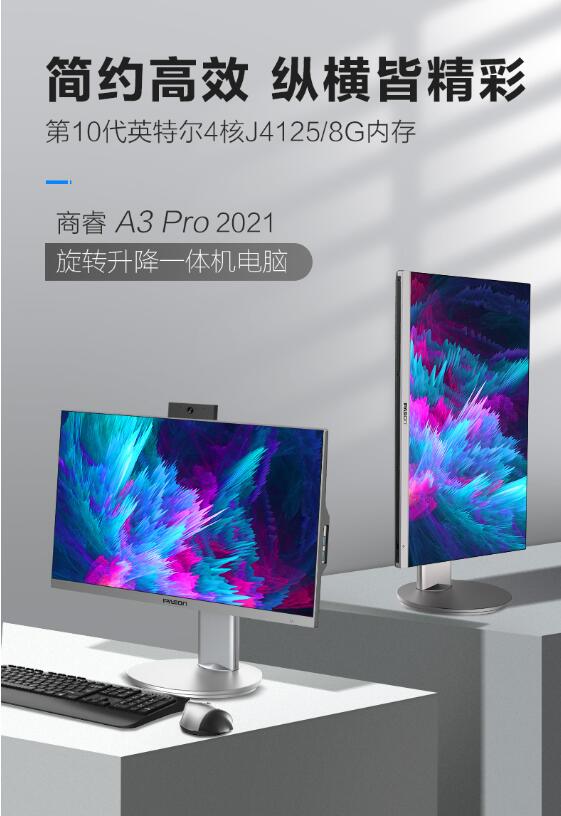 攀升A3Pro一体机的屏幕采用了目前最流行的三面窄边框设计,搭配178°广视角,屏占比高达89%。为23.8英寸屏幕带来更强的视觉沉浸感,辅以100%无坏点的IPS高清屏以及99%sRGB高色域,能让你体验到更加细腻准确的画面。而银灰色的机身则带来了高级的金属质感,竖屏浏览模式带来更多的可玩性。