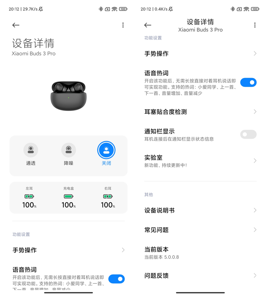 如果想要体验小米真无线降噪耳机3 Pro的全部功能,可以配合小爱同学APP使用,在小爱同学APP中可以查看蓝牙设备的连接情况,在APP中可以开启小米真无线降噪耳机3 Pro的语音热词功能,开启后可以直接通过语音的形式实现上一首、下一首等操作。