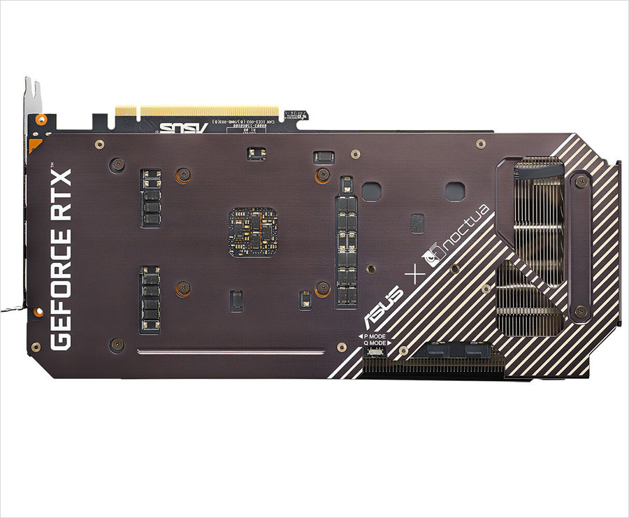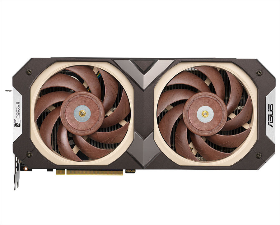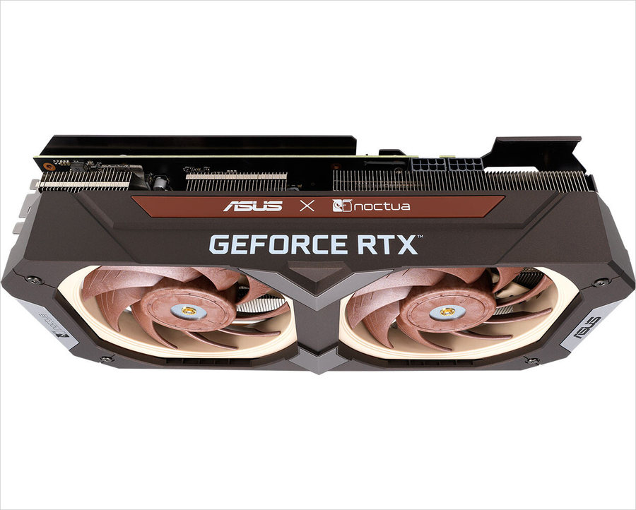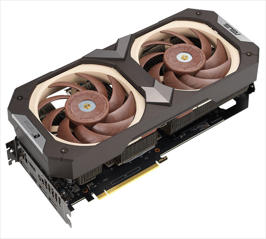 这款显卡的散热器为双风扇设计,风扇采用了经典的猫头鹰配色。笔者只是感觉这款散热器太厚了,看上去得有4个插槽的厚度,心仪的玩家们需要注意自己机箱的内部空间。