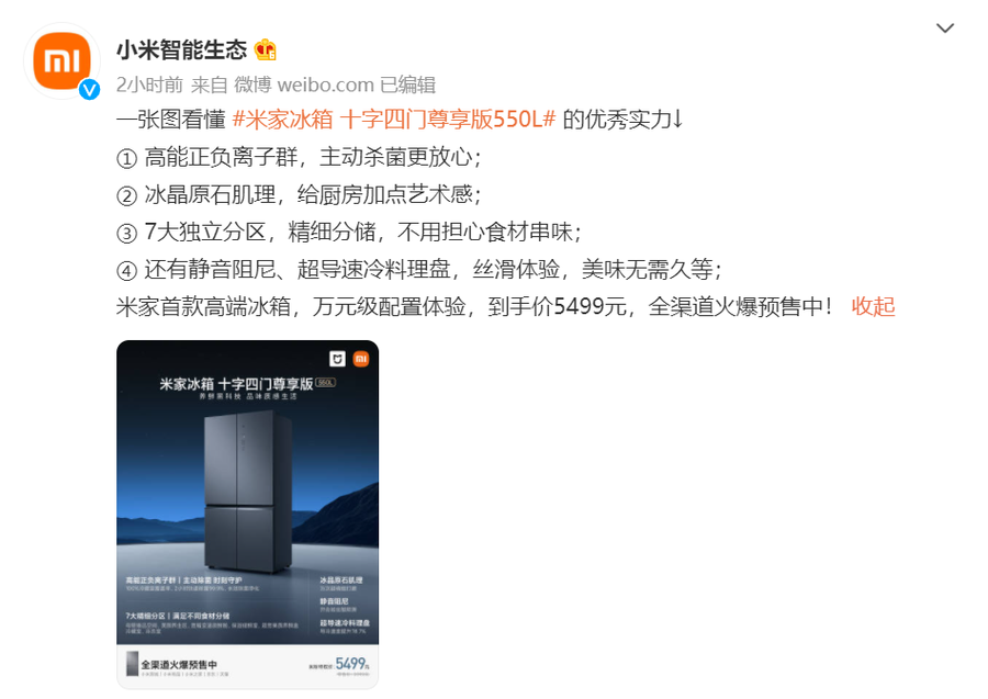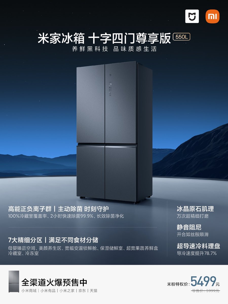 10月8日,小米官方公布了米家冰箱十字四门尊享版550L新品,到手价5499元,目前已经开启预售。