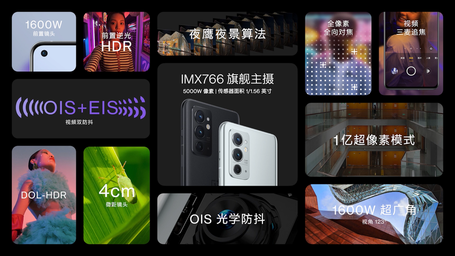 影像方面,一加 9RT 搭载旗舰传感器 IMX766,支持 OIS 光学防抖,配合全新研发的夜鹰夜景系统,极致发挥 IMX766大底在夜景上的优势,拍出清晰纯净的夜景照片。同时,一加 9RT支持一亿超像素算法,让照片画面放大后依旧清晰,细节丰富。另外,一加 9RT 拥有超强视频拍摄能力的DOL-HDR ,并支持全像素全向对焦,OIS+EIS 视频双防抖,视频三麦追焦,大大降低画面晃动感,动态捕捉更灵敏。得益于高端旗舰传感器的影像基础,配合夜鹰夜景系统、一亿超像素算法等加持,一加 9RT 从成像效果、夜景表现、画面细节上拥有越级影像的表现力。