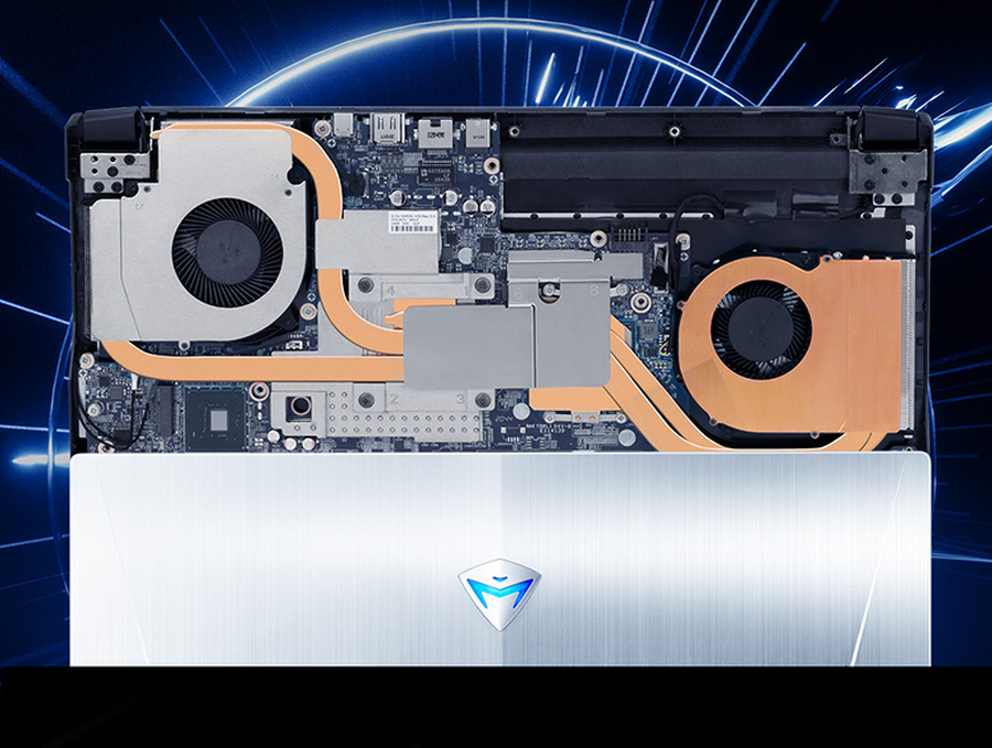 强大的散热设计也是机械师T58-V的制胜法宝之一。其采用了三排气风道设计,机身底部有大面积进风口,出风口分布在机身后方和左右两侧。同时,采用的四热管设计,4+2环绕布局,大面积铜质金属均热板能够快速传导热量。