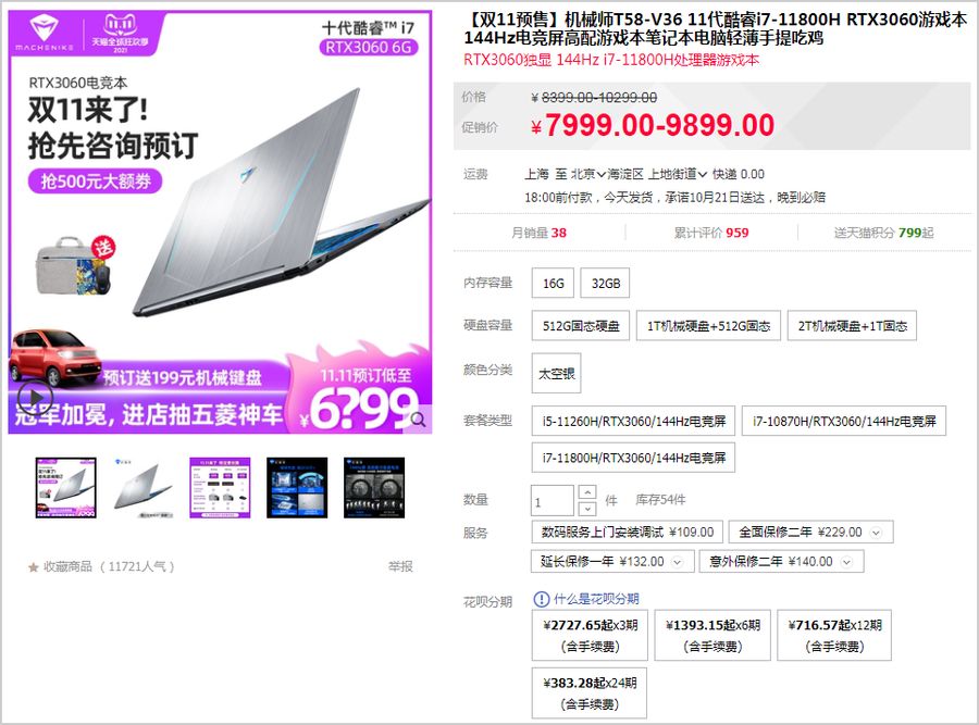 接下来,笔者将向大家再简单介绍一下机械师T58-V(i7-11800H/RTX3060/144Hz电竞屏)这款机型。