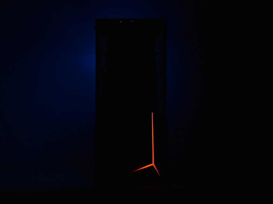 机箱前脸上面设计有个性化的图案,并且设计了通风散热隔栏以及橙色的电竞氛围灯。