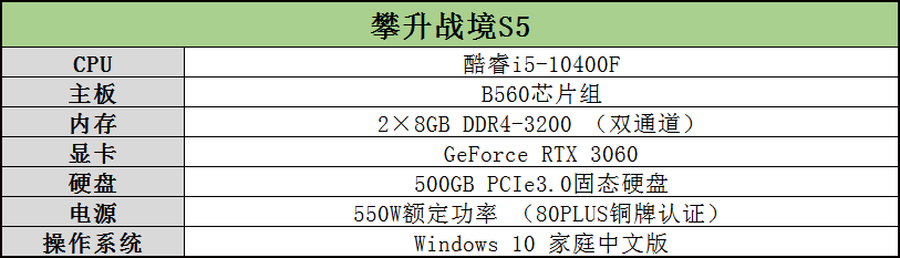GeForce RTX 3060显卡、酷睿i5-10400F六核处理器、B560芯片组主板、500GB PCIe3.0固态硬盘、80PLUS铜牌认证的额定550W电源,这就是笔者手中这款攀升战境S5的主要配置。