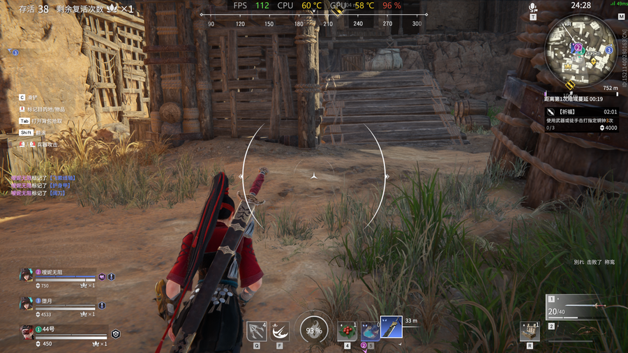 2560×1440分辨率,极高画质下,DLSS设置为超级性能。战斗时的游戏帧数为94帧左右。