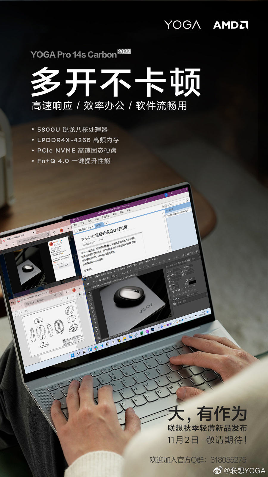 10月25日,联想YOGA官微透露,联想YOGA Pro 14s Carbon 2022将于11月2日正式发布。