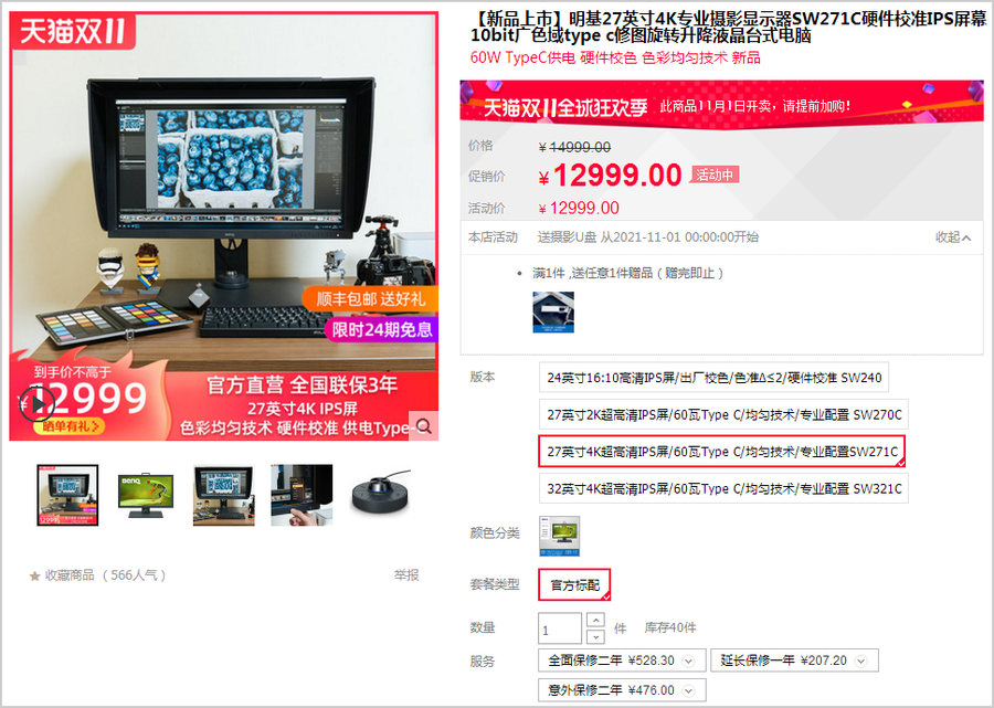 凭借着出色的4K画质,明基SW271C专业显示器一经上市便受到了众多摄影发烧友的追捧。现在有个好消息,那就是在即将到来的11.11开门红,这款发烧级摄像修图显示器到手价不高于12999元,并且还可享受24期分期免息福利,对这款专业装备心仪已久的用户们不容错过。