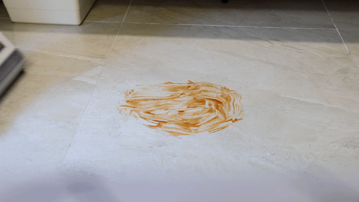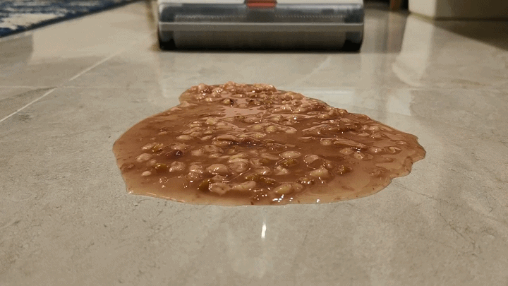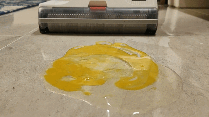 石头智能双刷洗地机 U10 可以轻松吸入常见的地面干湿垃圾,包括灰尘、碎屑、毛絮、饭粒、面条、鸡蛋、菜叶等等,这次我们使用番茄酱来进行简单的测试,从上面的动图可以看出,如此大面积并且比较粘稠的污渍,石头智能双刷洗地机U10基本上一次就能清洁干净,都不需要反复推拉进行多次清洁。