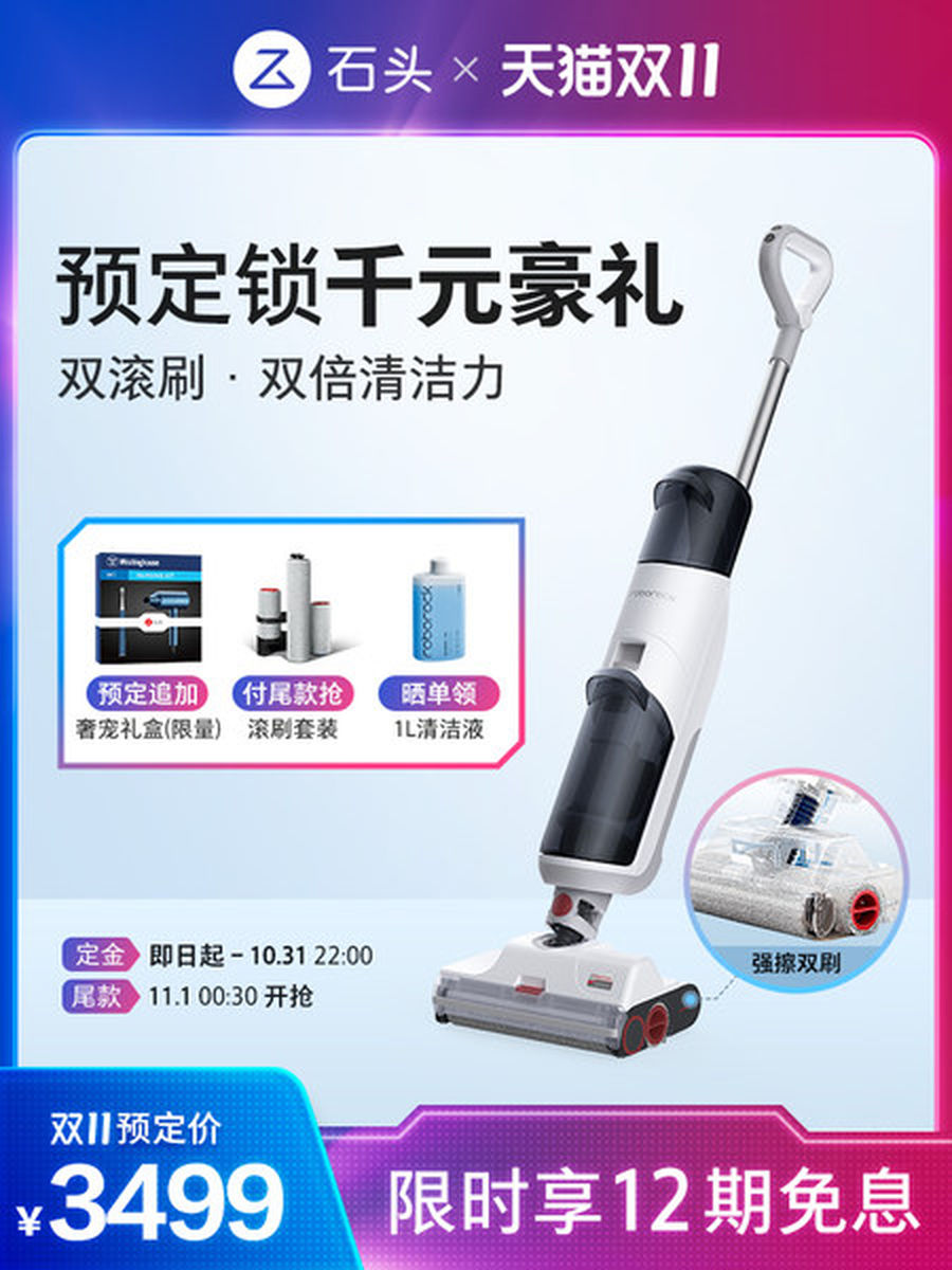 双十一之际,天猫石头电器旗舰店将放送千元豪礼,10月31日22:00前,100元参与预定石头智能双刷洗地机U10,限时享受3499元优惠价(原价4199元),以及12期花呗免息。同时还限量追加奢宠礼盒(内含电动牙刷、吹风机)、滚刷套装、清洁液等多重好礼,打算入手这款居家清洁神器的朋友快快行动起来吧~