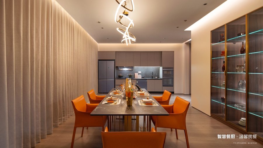 在餐厅场景,灯光照明可及时调整舒适亮度区间,联动HUAWEI Sound X音箱等可自动播放匹配场景的音乐,增进食欲。以烛光晚餐场景为例,当用户触发“烛光”场景后,餐厅关闭布帘与基础照明,氛围照明与重点照明调整至适合范围,层次丰富,享受美妙沉浸时刻。