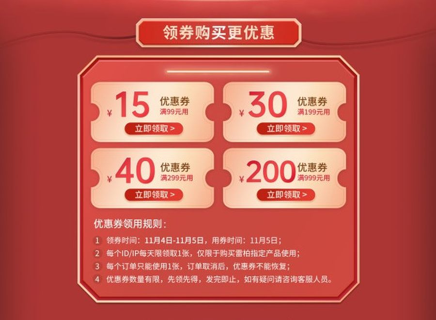 在活动页面,雷柏提供了满99减15元,满199减30元、满299减40元以及满999减200元的优惠券可领,指定产品使用满减优惠券后,到手价更低,11月4日到5日均可领取优惠券。