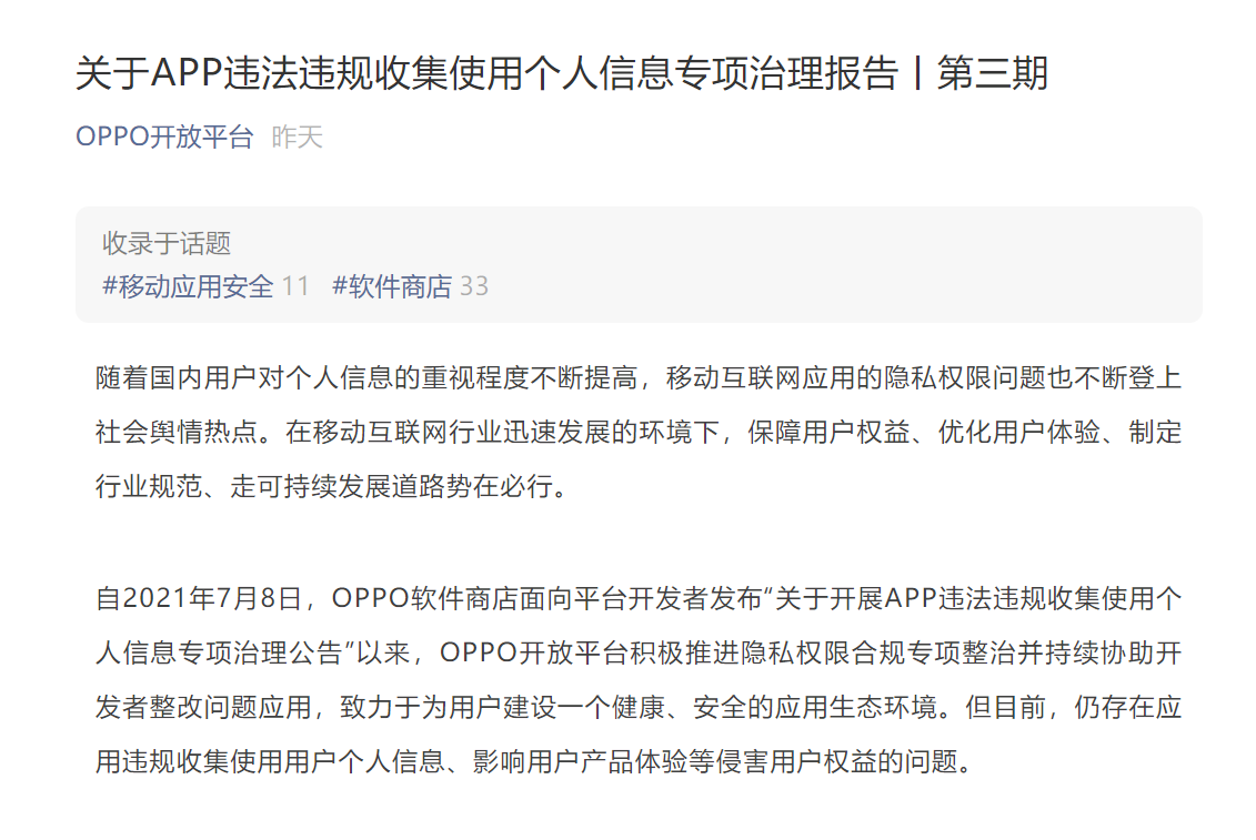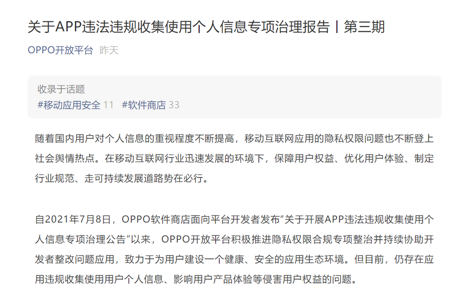 11月8日,OPPO开发平台公布了第三期APP违法违规收集使用个人信息专项治理报告,报告包括第三期治理期间APP违规情况,并且分析了违规的主要情形。
