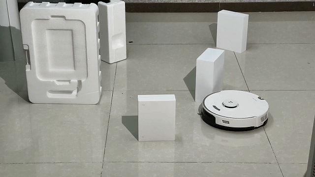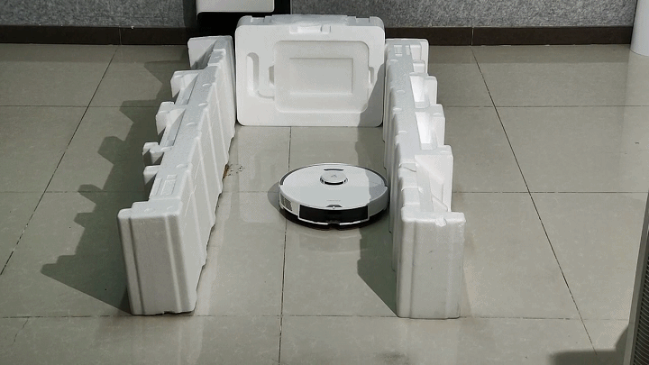 第一个我们就用一个长方形的泡沫来模拟突然出现的一堵墙,看看石头自清洁扫拖机器人G10能不能完美躲避。传统的扫地机器人主要通过碰撞式来进行线路移动清理,并不会对需要清扫的区域进行路线规划,石头G10所采用的LDS激光雷达则解决这种“盲撞式清理”,可以看到G10准确地检测出了泡沫盒子的存在,并且直接做出了躲避,而且还会延边进行清扫,让人很是放心。