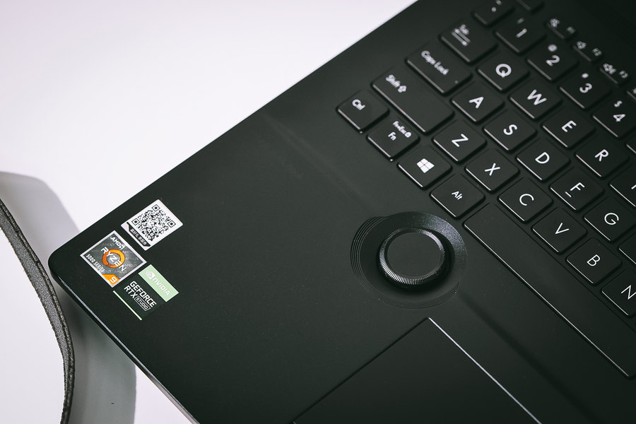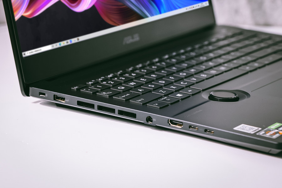 触控板左前方便是醒目的ASUS Dial物理创意旋钮了。支持旋转和按压操控,按压就是“确认”。值得一提的是,这枚ASUS Dial物理创意旋钮的手感很不错,有高级感。