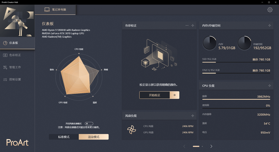 在ProArt Creator Hub可以对这款设计师笔记本进行性能模式的设置。这款设计师笔记本预设有两种性能模式,包括标准模式以及渲染模式。其中,渲染模式也是这款设计师笔记本的最强性能模式。