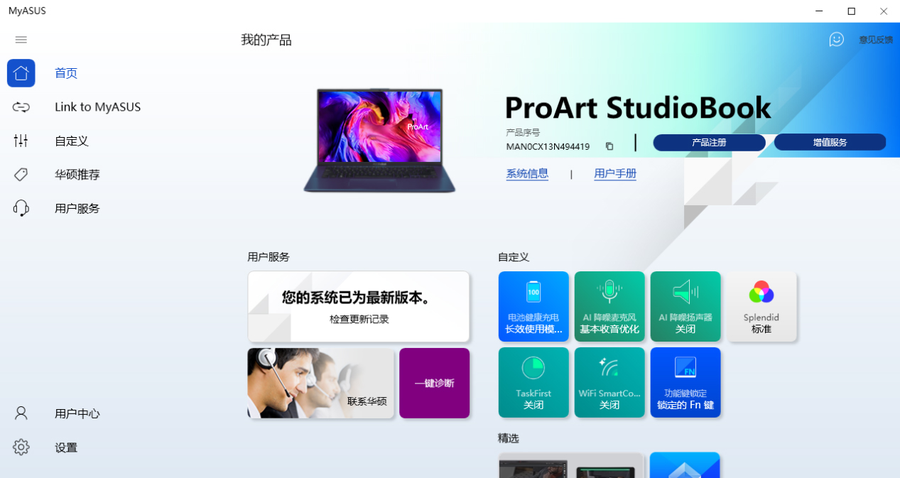 MyASUS是ProArt 创16的辅助控制中心,在这里可以对这款设计师笔记本进行一些实用功能的设置。