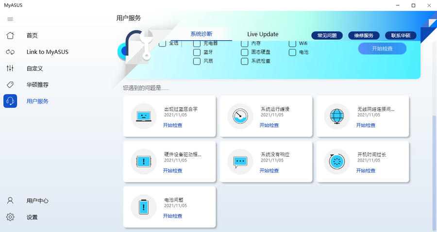 MyASUS还可以帮助诊断电脑系统状况,更新驱动程序等等。