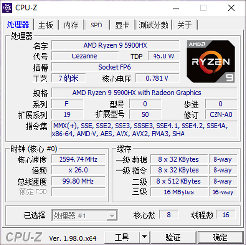 锐龙9 5900HX是目前市面上能见到的最强的AMD ZEN 3架构处理器,7nm工艺制程打造,8核心16线程,基础频率3.3GHz,最大加速频率可达4.6GHz,出厂预超频,并且拥有16MB三级缓存。ZEN 3架构相比ZEN 2架构能够实现19%的每时钟周期指令数(IPC)提升,以及24%的能效提升,进步是非常之大的。