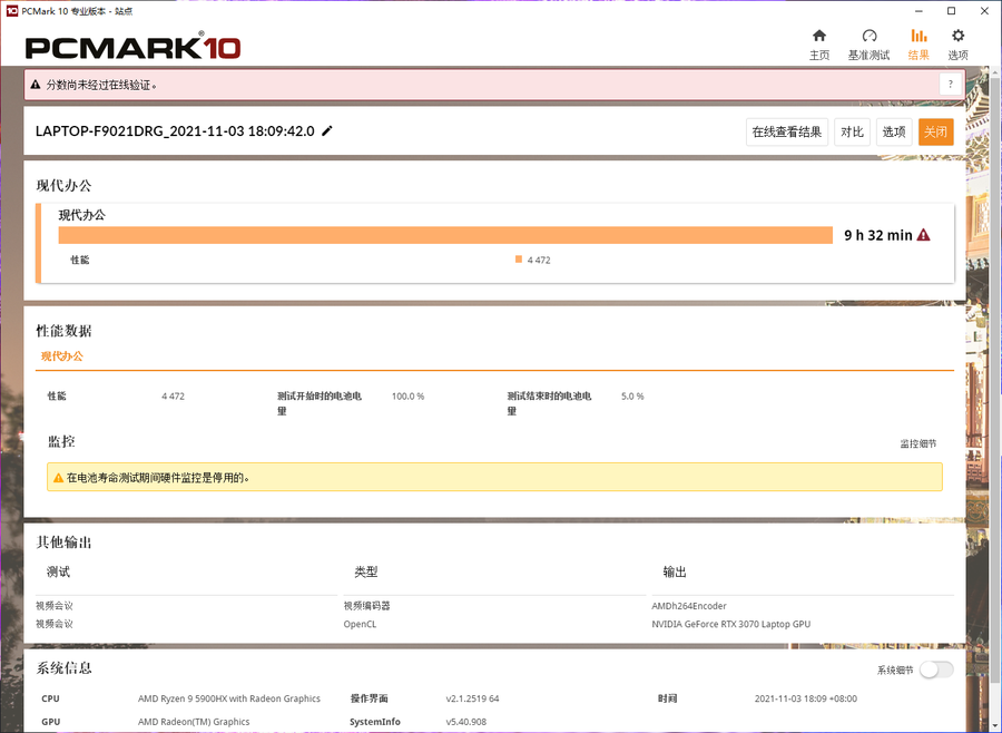 最终,这款设计师笔记本在PCMARK 10现代办公续航项目测试中,实现了9个小时32分钟的成绩,表现很好,能够满足一整天强度较高的移动办公需求。