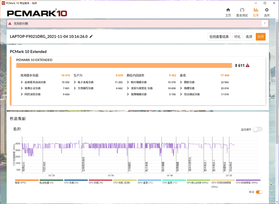 从PCMARK 10的测试结果来看,这款设计师笔记本不仅在常用基本功能、生产力、数位内容创作的的成绩都很好,而且游戏的成绩也是很好的,设计师们在工作之余也可以玩一玩大型3A游戏,放松一下心情。