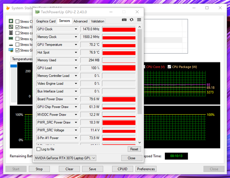 开启双烤机10分钟之后,这款设计师笔记本的CPU温度稳定在了约93℃左右,频率稳定在了约3.27GHz,此时功耗约为69W。GPU温度温度稳定在了约70℃左右,此时功耗约为80W。