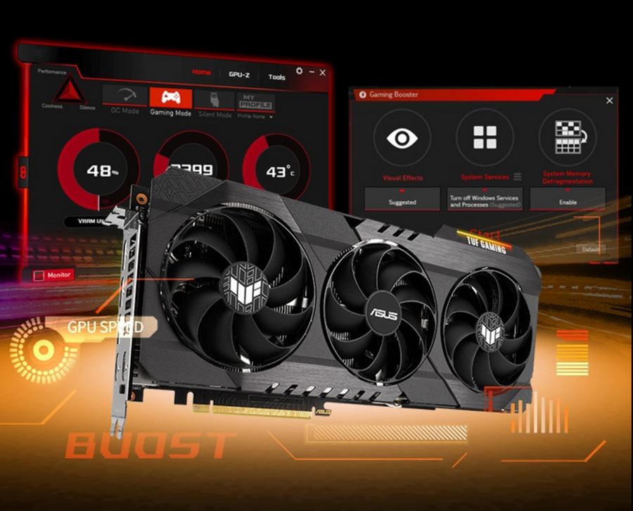 这款显卡采用三风扇设计,并使用全新升级的轴流风扇,运行更加高效且静音,寿命也更长。中央风扇反转设计,减少散热模组内的空气乱流,大幅提高散热效率。搭配风扇智能启停功能,55度以下风扇完全停转,提供更加安静的使用体验。散热底座采用镜面抛光工艺,让核心紧贴超大的散热模组,搭配VRAM散热片,全金属通风背板,进一步提升散热效率。虽然走的是“硬汉简洁风”,但华硕还是为TUF RX6700XT配备了一条灯带和一个TUF的可发光LOGO,自然也支持神光同步,使用Armoury Crate可对RGB灯光进行自定义设计,烘托起了电竞氛围。