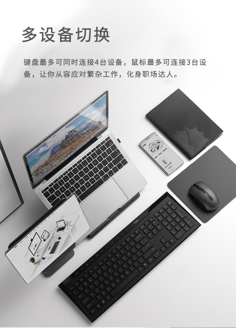 8200G有着蓝牙5.0/3.0和无线2.4G三种智能连接模式,传输稳定可靠,适配设备广泛,搭配多设备切换,键盘最多可同时连接4台设备,鼠标最多可连接3台设备,让你可以在已连接的设备间来回切换,仿佛拥有分身技能,面对众多繁琐工作亦能轻松应对。