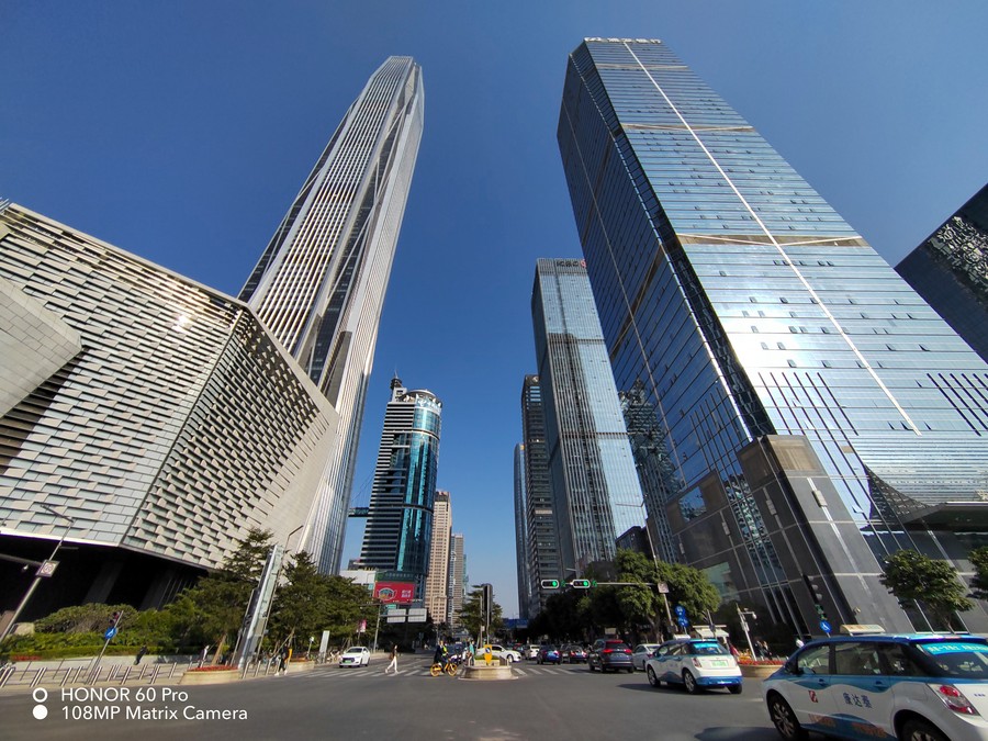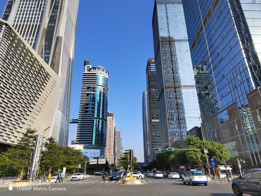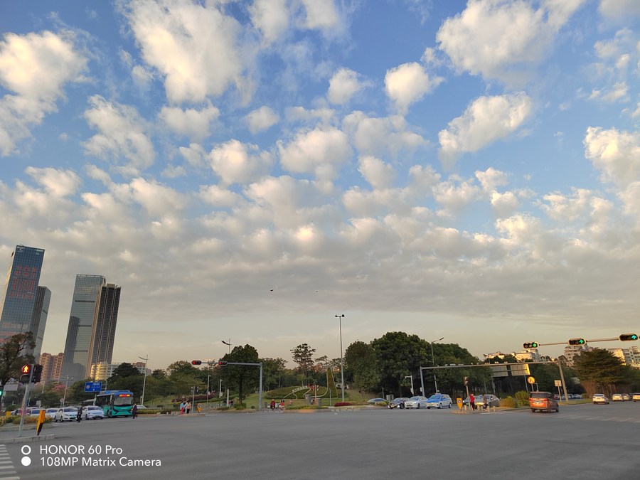 上面的这图片拍摄于晨间,各种大厦的玻璃幕墙存在一定的太阳光反射,而树木上的绿叶也存在一定的染色光晕,绿叶稍显偏暖,而天空是极为澄澈的蓝色。荣耀60 Pro的拍摄将肉眼所见到的内容还原的非常到位,并且对于部分建筑物的太阳光反射也进行了一定的压制,达到了更好的观感。