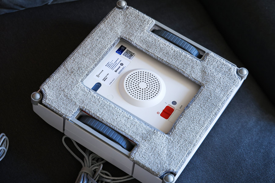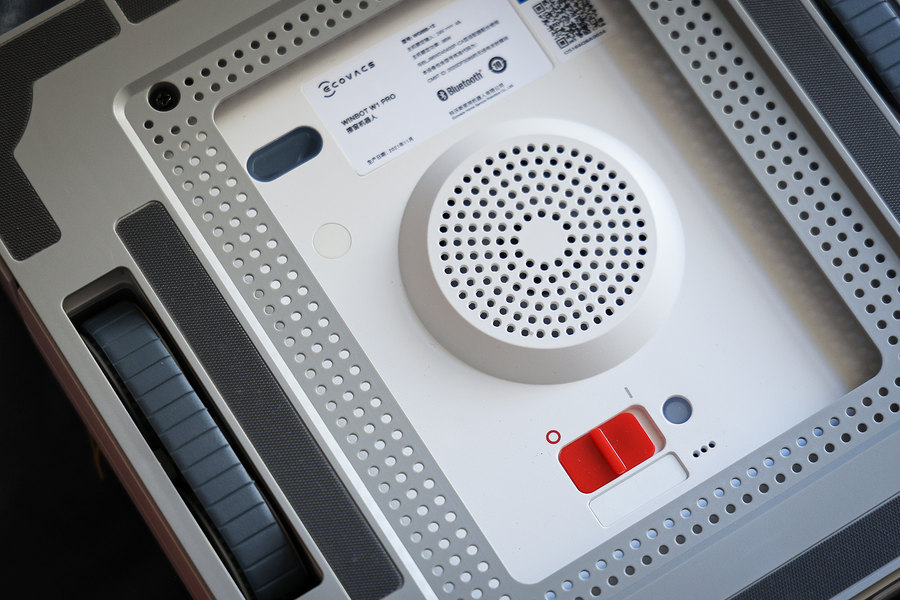 科沃斯WINBOT W1 Pro底部正中为提供真空吸力的风机,提供了2800Pa超大真空吸力,可以将产品“吸”在窗户上,并且在底部还设置了吸力感应器;红色的则是电源开关,在与手机进行配对以及开始使用时需要拨至“I”的这一侧。四个角还配备灵活的球头,有效减少灰尘进入带来的阻塞感,并且在进行沿边清洁时更顺滑。