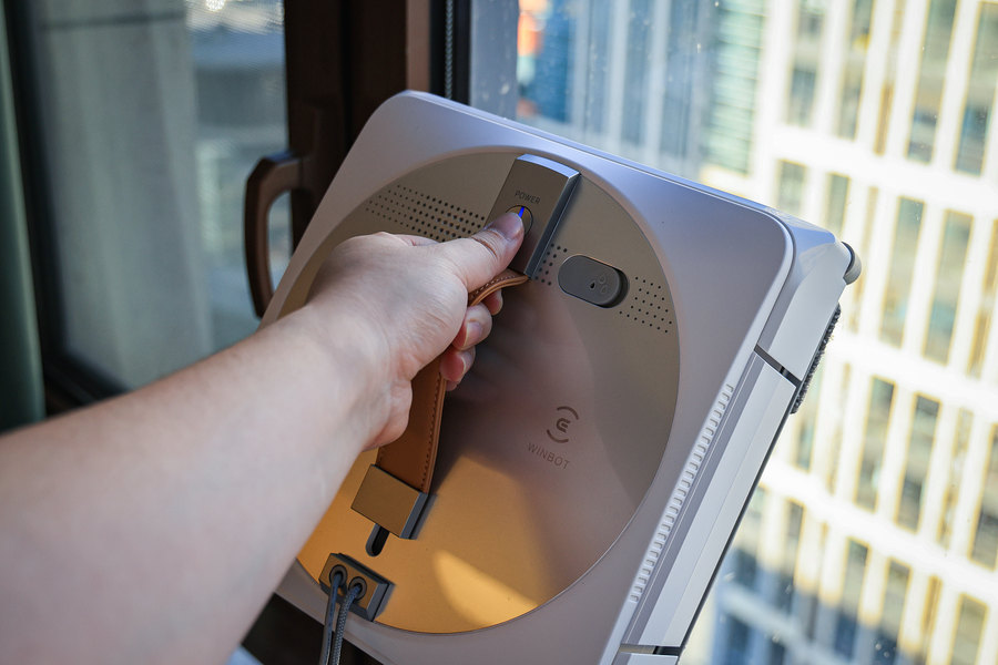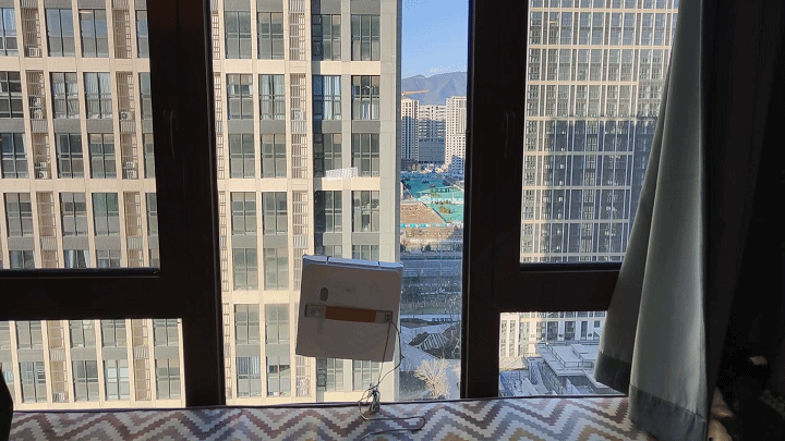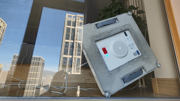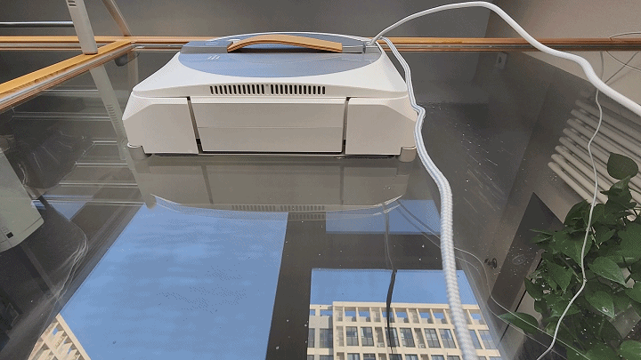 接下来,我们来实际使用一下科沃斯WINBOT W1 Pro擦窗机器人,看看其效果如何吧。打开底部电源开关后再按一下提手上方的启动按键就能将科沃斯WINBOT W1 Pro直接吸附到窗上,然后机器人便自动开始运行。