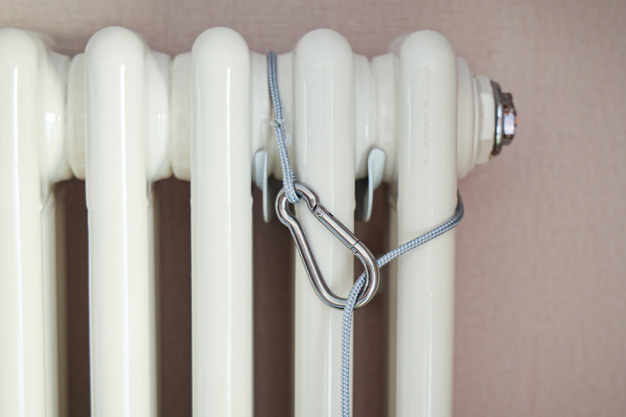 安全绳可以防止机器人意外跌落造成安全事故,所以在进行外窗清洁时一定要固定好安全绳。比如可以绑在窗户的防盗网或者栏杆上,如果是大落地窗的话,可以选择附近比较方便固定的地方,如我家的暖气片离窗户比较近,所以选择绑在了暖气片上。