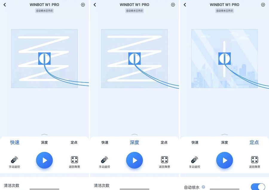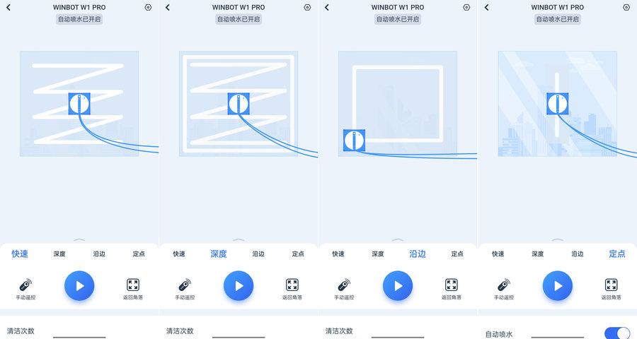 在强大的WIN-SLAM3.0路径规划技术支持下,科沃斯WINBOT W1 Pro提供了3种不同的情况模式,可对应3种不同的场景,并且保证不漏擦、不重复。选择快速模式,机器人按照Z字型进行路径规划,快速的清洁一遍,适合定期清洁的朋友;深度清洁,则是Z形加上边框清洁,适合有深度脏污的清洁需求;定点清洁可指定范围内反复清洁四遍,适合顽固污渍的清洁需求。