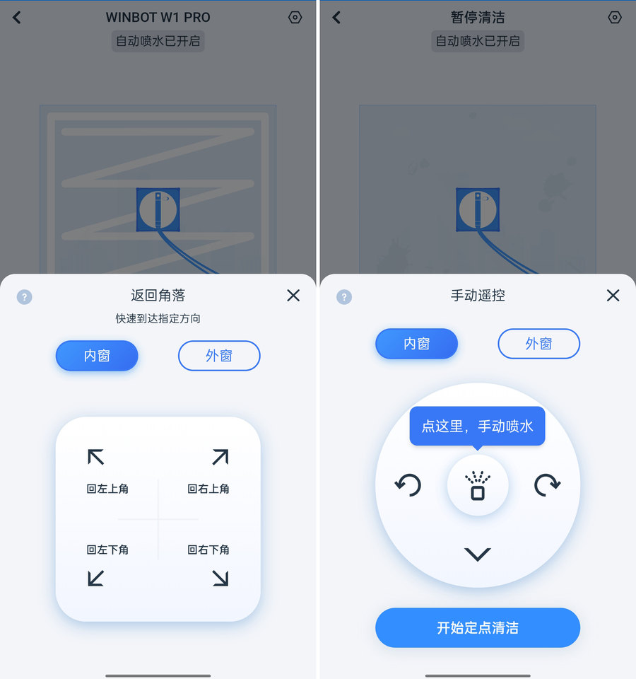 从上面的动图中可以开看,科沃斯WINBOT W1 Pro在进行清洁时会先在要经过的位置自动喷水,不仅前进时喷水,后退时也喷水,保证清洁液可以覆盖到每块擦拭的玻璃上,喷水的范围也更广更均匀,相比起直接喷洒抹布,自喷水则具备更大水量,擦窗也更干净。还值得一提的是,在水或者清洁液用完后还有语音提醒,方便我们及时补充。