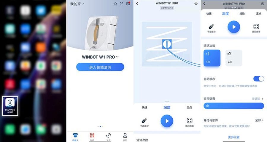 手机上下载ECOVACS HOME APP,配对完成后可对机器人进行操控