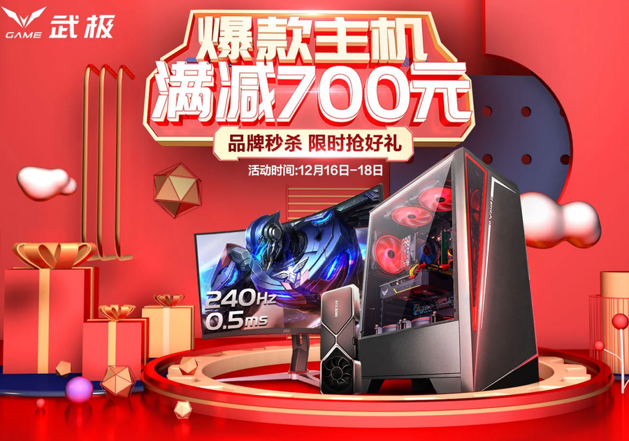 12月16号至18号,武极电脑DIY旗舰店开启品牌特惠活动,超多热销机型参与其中,更有爆款主机满减大促以及限时抢好礼等购机福利,近期有意购置新电脑的用户们可以上网瞧一瞧。