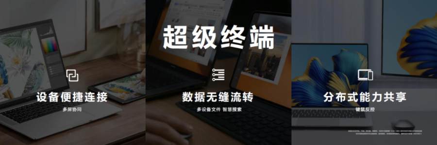 智慧化功能一直是华为MateBook系列的王牌功能,此次更是加入了超级终端,可让“华为生态”内多设备协同配合,例如平板、手机、智慧屏等。通过控制中心进入超级终端界面,按住或拖拽设备图标即可完成连接,做到“一拉即合”,可被超级终端协同的设备包括手机、平板、显示器、智慧屏和其他华为智慧办公类产品,笔记本终于也可成为控制中心。手机也无需依赖多屏协同,可更高效的组成超级终端。